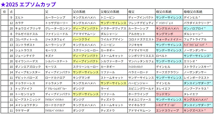 過去の傾向から血統を点数化、今年の出走馬にランク付けして予想しています。
