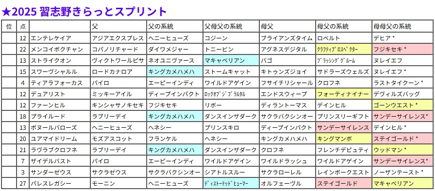 過去の傾向から血統を点数化、今年の出走馬にランク付けして予想しています。
