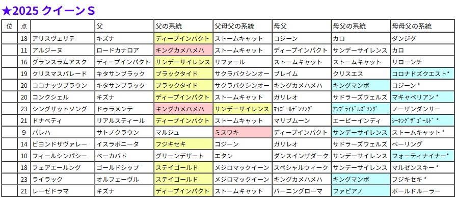 過去の傾向から血統を点数化、今年の出走馬にランク付けして予想しています。