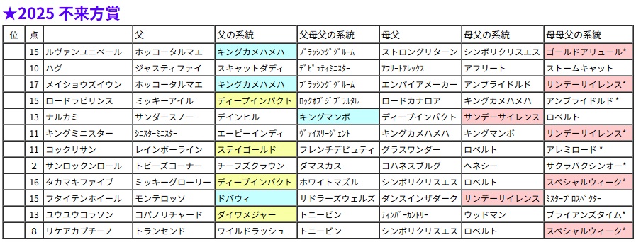 過去の傾向から血統を点数化、今年の出走馬にランク付けして予想しています。