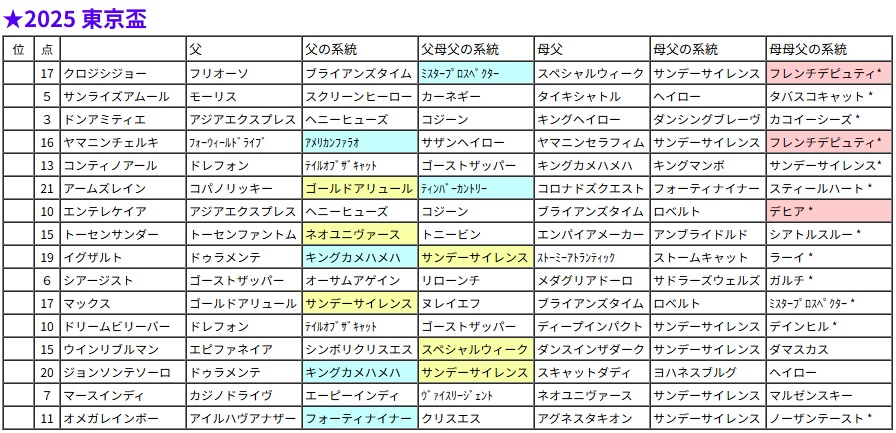 過去の傾向から血統を点数化、今年の出走馬にランク付けして予想しています。