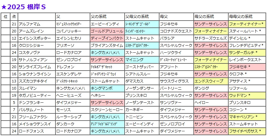 過去の傾向から血統を点数化、今年の出走馬にランク付けして予想しています。