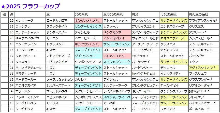 過去の傾向から血統を点数化、今年の出走馬にランク付けして予想しています。