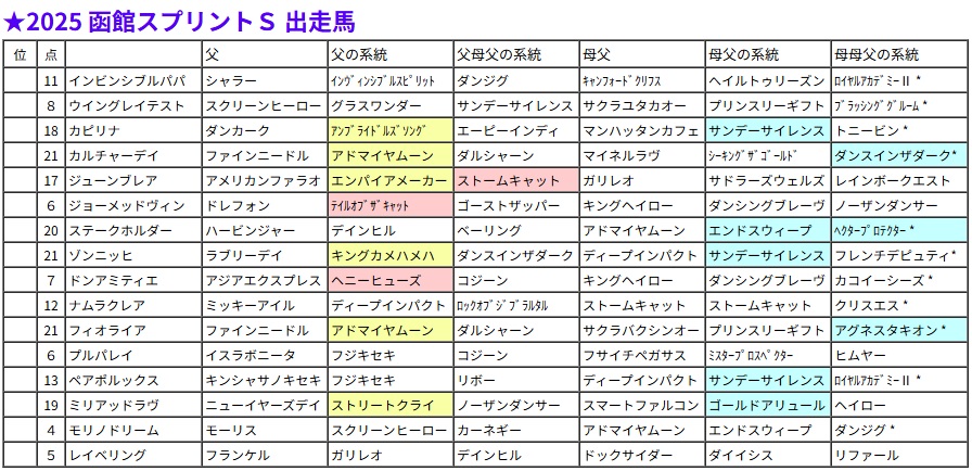 過去の傾向から血統を点数化、今年の出走馬にランク付けして予想しています。