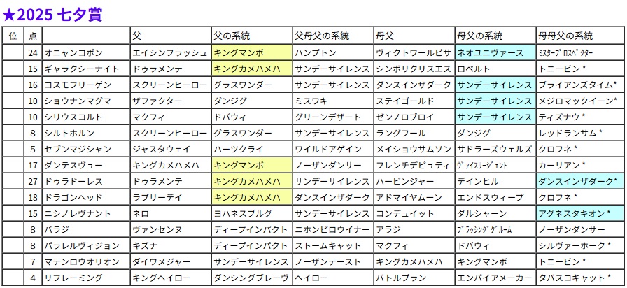 過去の傾向から血統を点数化、今年の出走馬にランク付けして予想しています。