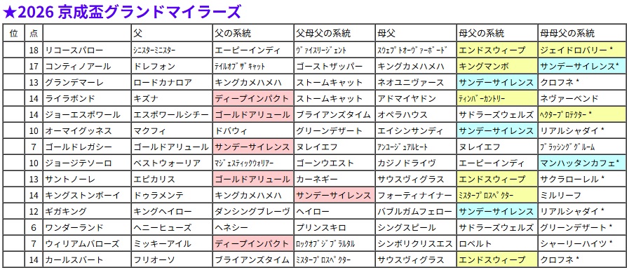 過去の傾向から血統を点数化、今年の出走馬にランク付けして予想しています。